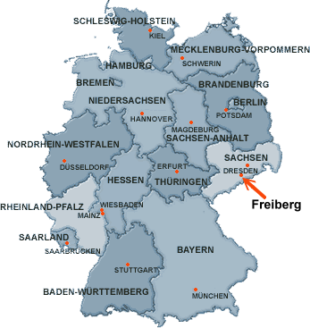 | | Lage der Stadt Freiberg Freiberg befindet sich im Zentrum von Sachsen, auf halber Strecke zwischen Dresden und Chemnitz. Freiberg ist gut, über die Autobahn A 4 zu erreichen. Bei der Abfahrt Siebenlehn verläßt man die A 4 und fährt auf die B 101, in Richtung Freiberg ab. Lage der Wohnung In Freiberg angekommen fährt man entsprechend der Ausschilderung in Richtung Chemnitz. Man folgt der B 173 bis zum Ortsausgang Freiberg und biegt dort nach rechts, in Richtung Kleinschirma (TC-Tankstelle) ab. Nach ca. 500 m kommt rechts das 'Waldhaus Freiberg'. |